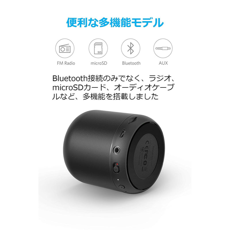 Bluetoothだけでなく、microSDカードやAUXモードにも対応。FMラジオも受信することができるので、様々な用途に対応しています (FMラジオを使用する際は、micro USBケーブルを接続してください) 。