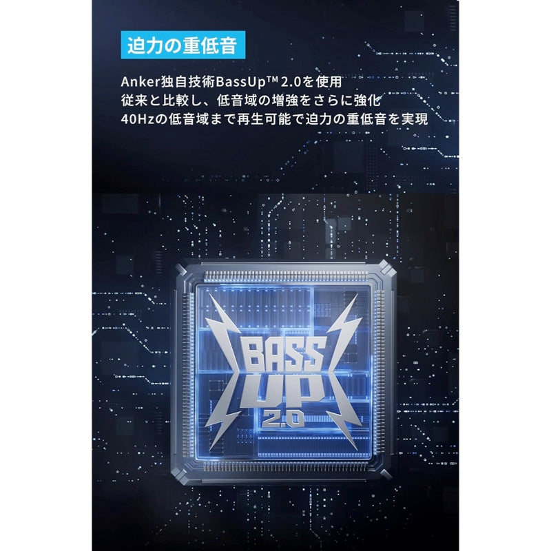 Anker独自技術BassUp2.0を使用。従来と比較し、低音域の増強をさらに強化。40Hzの低音域まで再生可能で迫力の重低音を実現。IPX7の防水性能