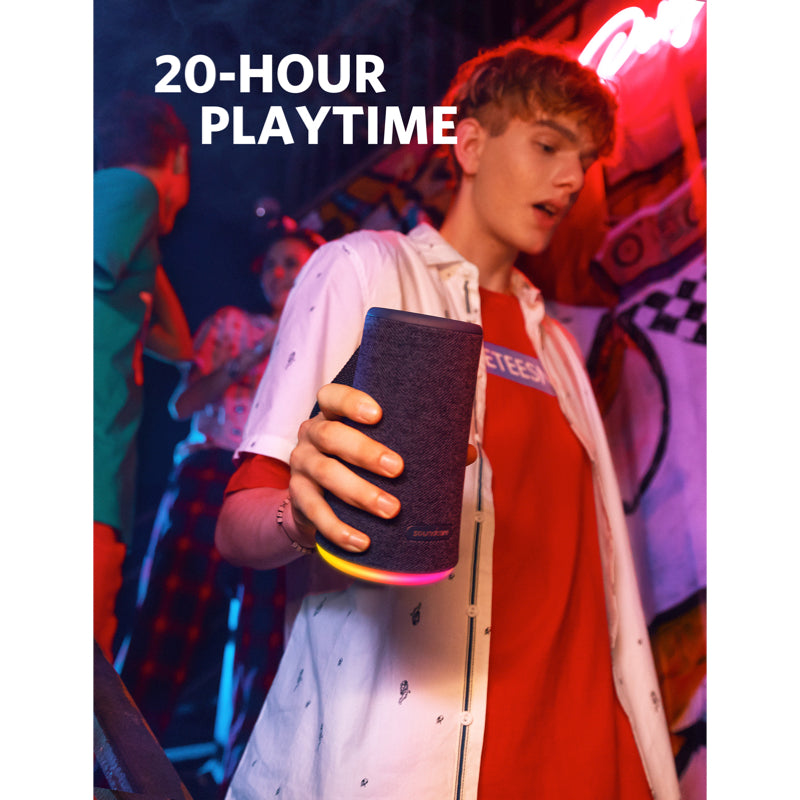 音楽に合わせて変化する円状のLEDライトによって、完璧なオーディオビジュアル体験をお楽しみいただけます。Soundcoreアプリをダウンロードし、5つのカラーテーマと5種類のイルミネーションパターンから利用シーンに応じてお好みの演出をお楽しみください。20時間連続再生