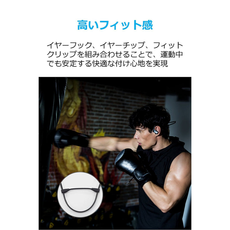 | パッケージ内容 | Anker SoundBuds Sport NB10、Micro USB 充電ケーブル、イヤーチップ(S/M/L)、フィットクリップ、トラベルポーチ、取扱説明書、18ヶ月保証 + 6ヶ月 (Ankerで会員登録後)、カスタマーサポート |