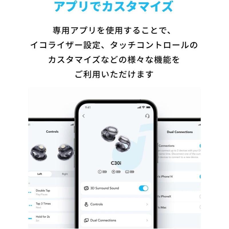| パッケージ内容 | Soundcore C30i 、充電ケース 、イヤーカフキャップ (2種、サイズ:M / L) 、USB-A & USB-C ケーブル、18ヶ月保証 + 6ヶ月 (Ankerで会員登録後) 、カスタマーサポート |
