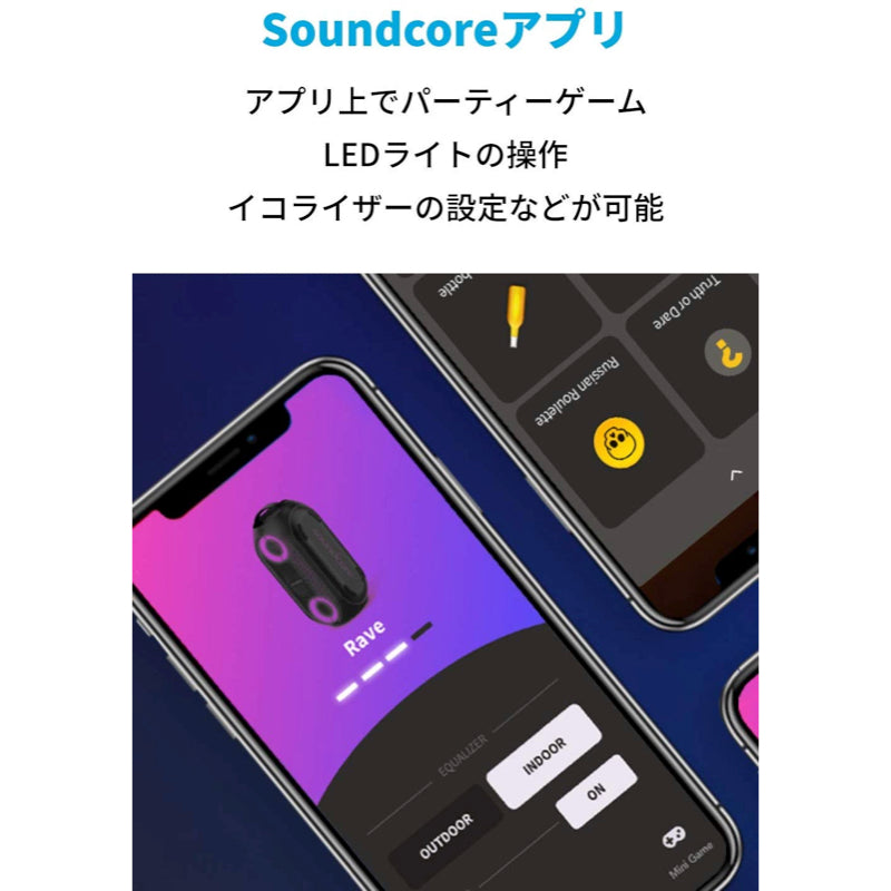 Rave Miniの正面に位置する2つのLEDライトが音楽に合わせて変化します。SoundcoreアプリのDJ機能を使えば、好みに合わせてLEDライトを変更できます。一晩中使える