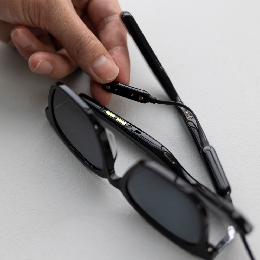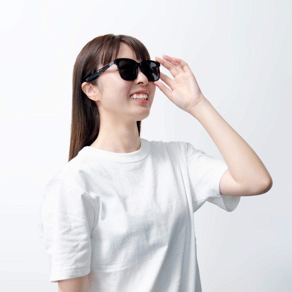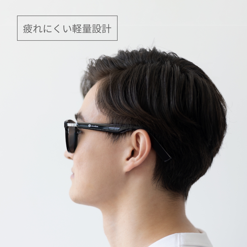 見た目は普通のサングラスのようでありながら、耳の周りに搭載したスピーカーから音が流れ、耳を塞がない音楽体験を実現するオーディオサングラス。スピーカーを搭載するテンプル (つる) も太すぎず、気軽に普段使いしやすいデザインです。