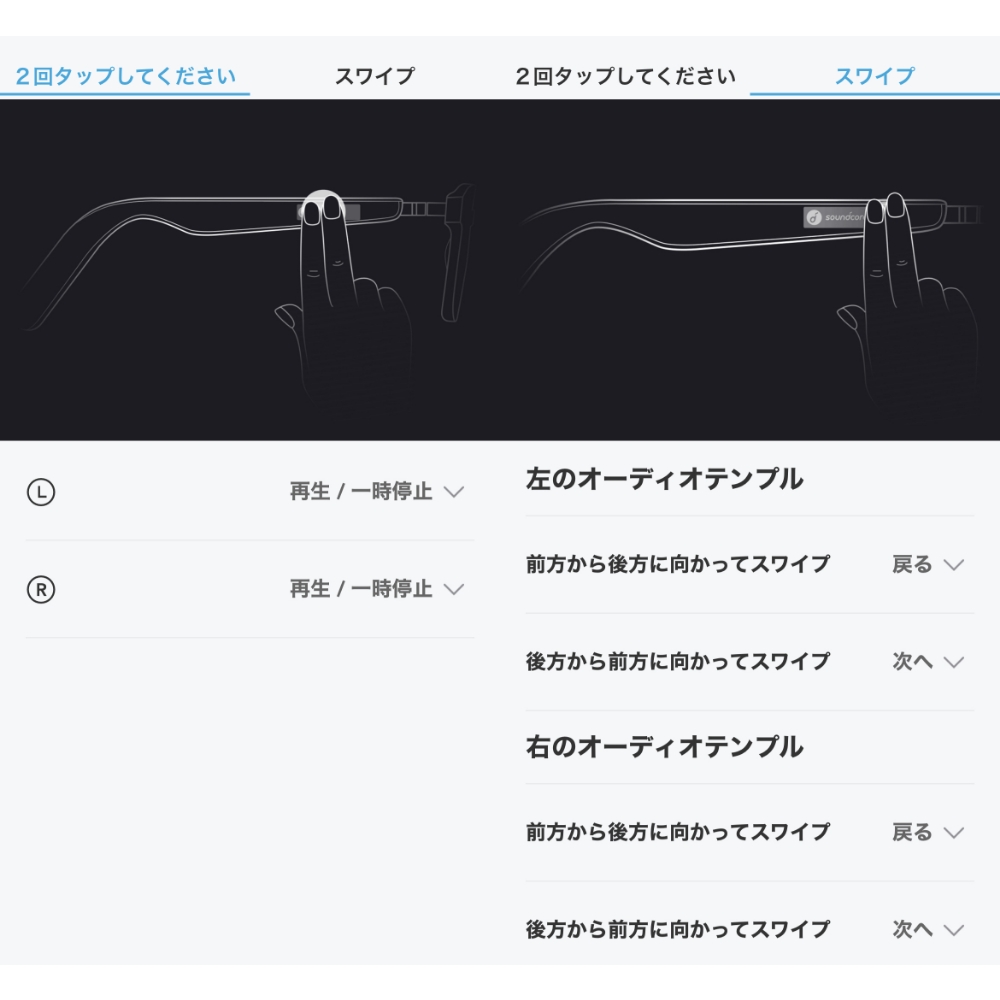 ・電源がオンになっていることを確認後、本製品を顔にかけて両方のオーディオテンプルのロゴ部分を3秒間タッチしてください。