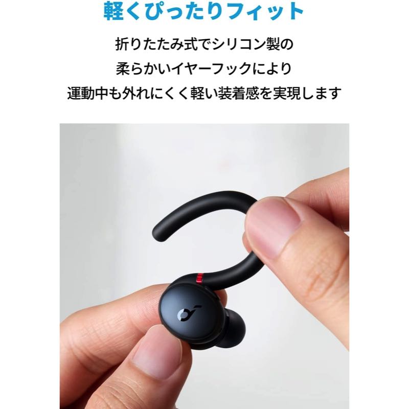 柔らかい質感のシリコン製のイヤーフックにより、快適で軽い付け心地を実現。激しい運動中も外れにくく、耳にしっかりとフィットします。また、イヤーフックを折りたたんでケースに収納することができ、持ち運びやすいコンパクトなサイズ感を実現しました。