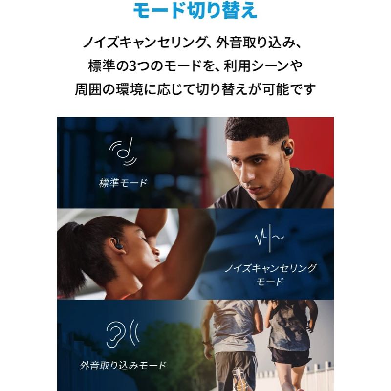 大型の10mmドライバーとAnker独自のBassUp™テクノロジーを搭載。パワフルな重低音で音楽をお楽しみいただけます。また、ノイズキャンセリングモードを選択するとイヤホンに搭載された4つのマイクが周囲の騒音を検知し、アクティブノイズキャンセリングによって自動車や飛行機のエンジン音、ランニングマシンなどのジムの機械音など、低周波ノイズを除去します。外部の音も聞きたい環境下では、外音取り込みモードに切り替えることで、会話や公共施設のアナウンス等の外音を取り込むことができます。