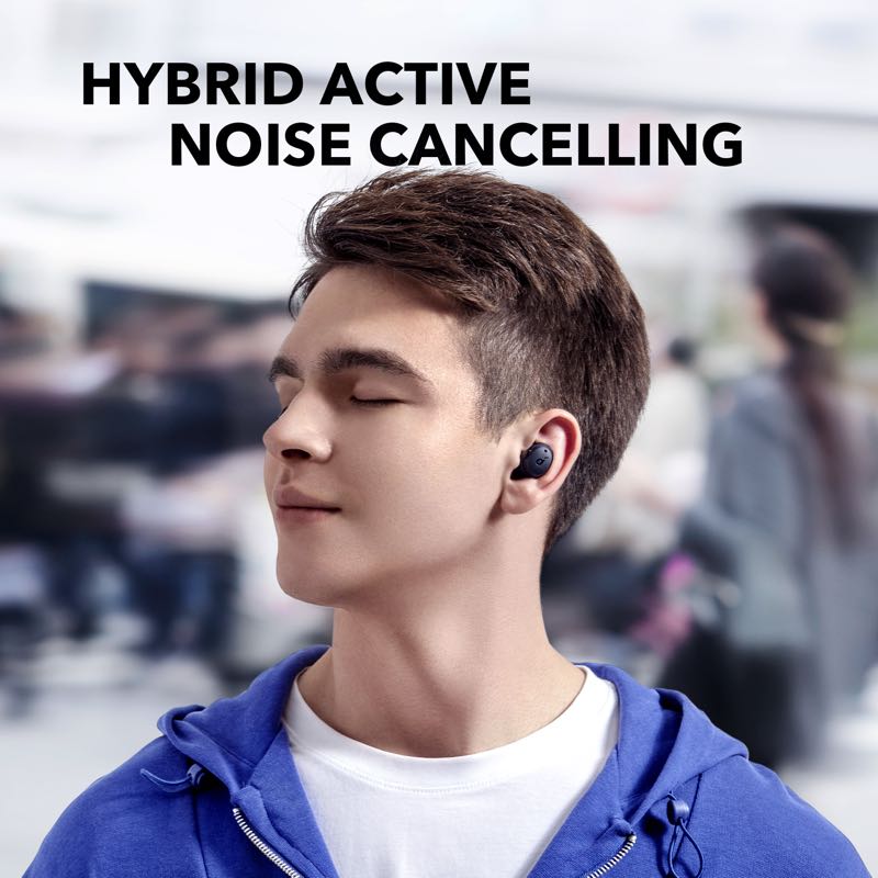 イヤホンに搭載された4つのマイクが周囲の騒音を検知し、アクティブノイズキャンセリング (ANC) によって自動車や飛行機のエンジン音などの低周波ノイズを除去します。外音取り込み機能