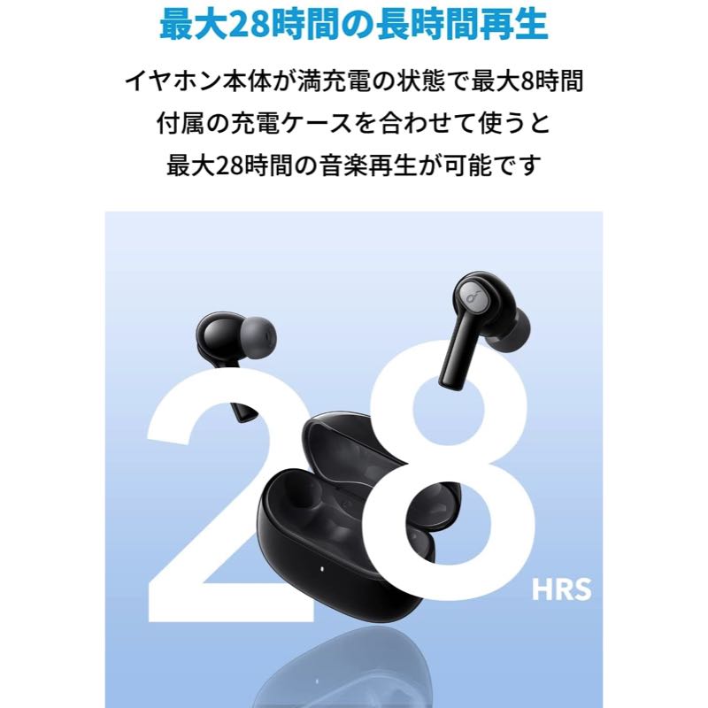 | 再生時間 | 最大8時間 (イヤホン本体のみ) / 最大28時間 (充電ケース使用時) |