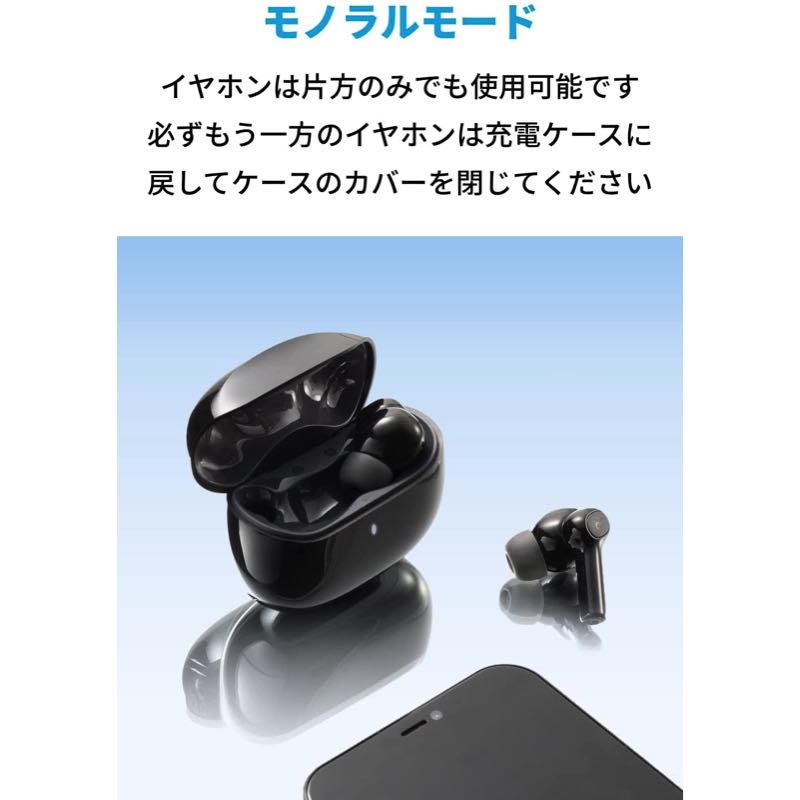 左右のイヤホンの単独使用と両耳での使用を簡単に切り替えることができます。※片耳使用時は、もう片方のイヤホンを充電ケースに戻し、ケースの蓋を閉じてください。