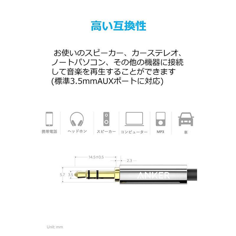 | パッケージ内容 | Anker プレミアムオーディオケーブル、18ヶ月保証 + 6ヶ月 (Ankerで会員登録後)、カスタマーサポート |