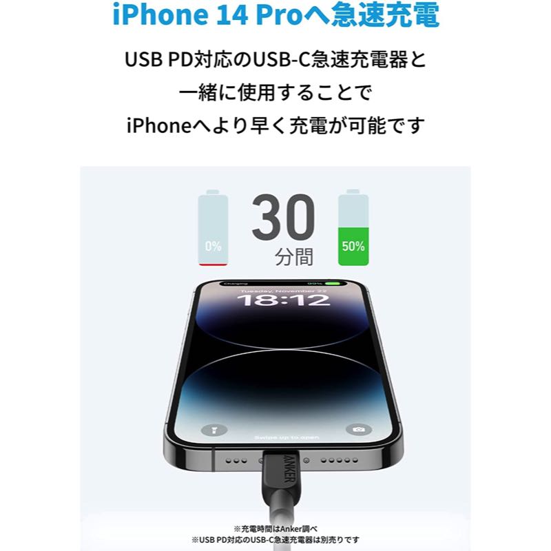 USB PD対応のUSB-C急速充電器 (別売り) と一緒に使用することで、iPhone 14 Proを30分で50%まで充電可能です。 (※充電時間はAnker自社調べ)優れた耐久性