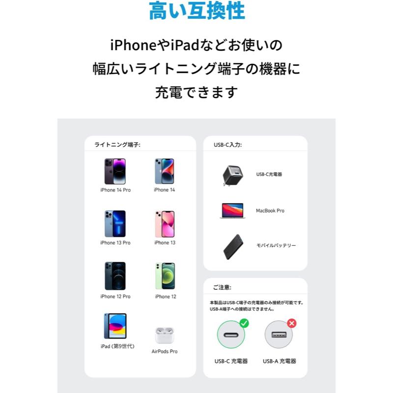 | 対応機種 | 急速充電対応 - スマートフォン:iPhone 14 / 14 Plus / 14 Pro / 14 Pro Max / 13 / 13 mini / 13 Pro / 13 Pro Max / 12 / 12 mini / 12 Pro / 12 Pro Max / SE (第3世代) / SE (第2世代) / 11 / 11 Pro / 11 Pro Max / XS / XS Max / XR / X / 8 Plus / 8 他 - タブレット端末:iPad (第9世代) / iPad Air (第3世代) / iPad Pro (12.9インチ) (第2世代) / iPad mini (第5世代) 他 - その他:AirPods Max 急速充電非対応 - スマートフォン:iPhone 7 / 7 Plus / iPhone SE (第1世代) / 6S / 6S Plus / 6 / 6 Plus - タブレット端末:iPad Air (第1世代) / iPad Air (第2世代) / iPad mini (第2世代) / iPad mini (第3世代) / iPad mini (第4世代) / iPad 7/ 6 / 5 - その他:AirPods / AirPods Pro |