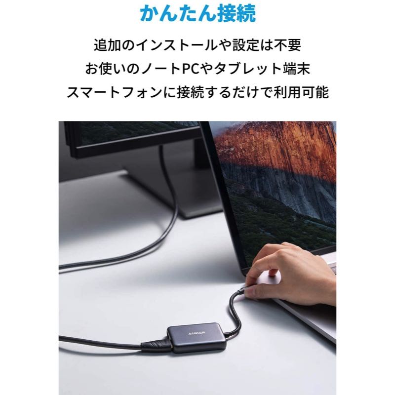 追加のインストールや設定が不要で、お使いのノートPCやタブレット端末、スマートフォン等のUSB-C ポートに接続するだけで高画質の画面出力をお楽しみいただくことができます。