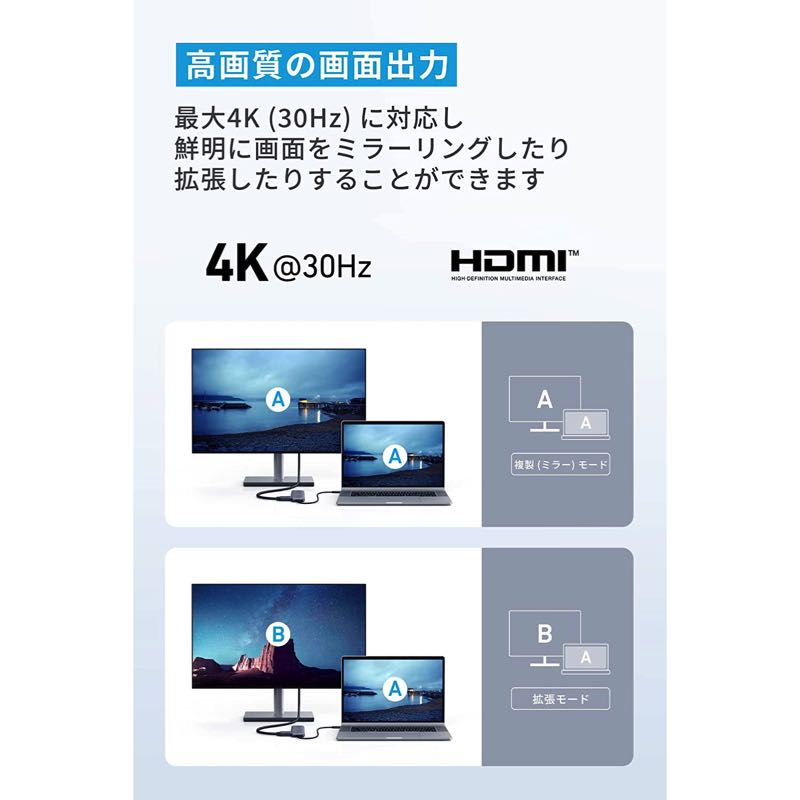 HDMIポートを使用して、最大4K (30Hz) の画像出力が可能です。鮮明に画面をミラーリングしたり拡張したりすることができます。※USB-Cポートは映像出力に非対応です。