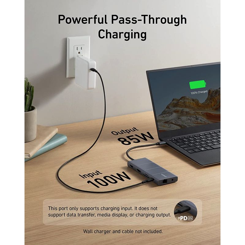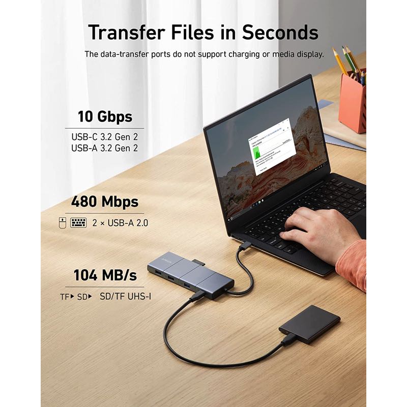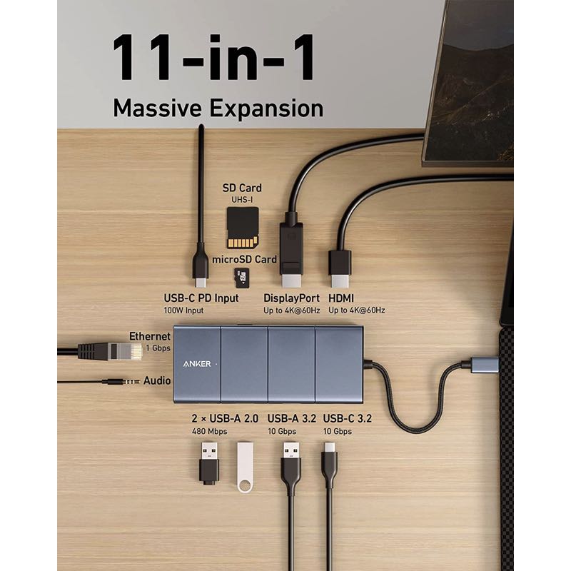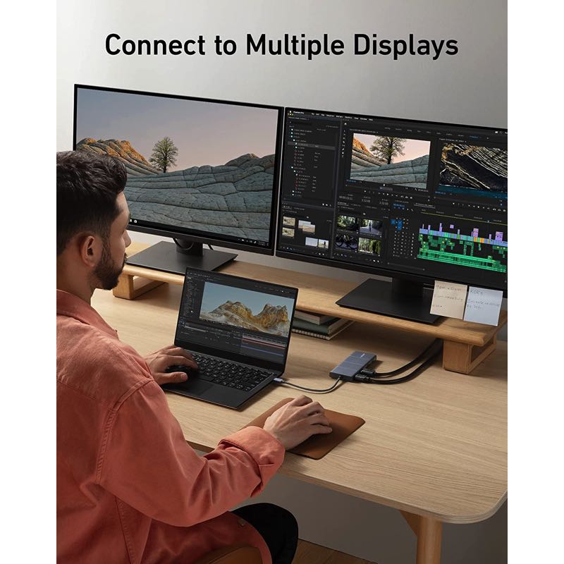 パススルー急速充電が可能なUSB Power Deliveryに対応したUSB-Cポート、データ転送用USB 3.2 Gen 2 対応のUSB-C ポートとUSB-A ポート、2つのUSB-A 2.0ポート、4K (60Hz) 対応のHDMIポート、イーサネットポート、DisplayPort、microSD & SDカードスロット、3.5mmオーディオジャックの11のポートを1つのハブにまとめることで、マルチタスクが可能になりました。複数ケーブルの抜き差しの手間を省きます。高速データ転送