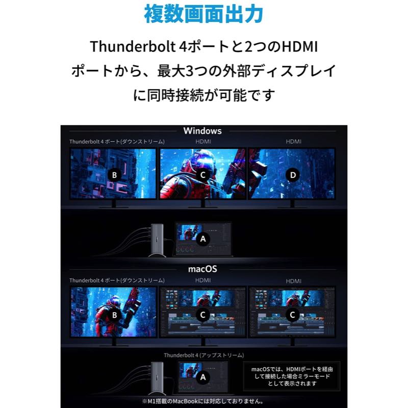 | 非対応機種 | - M1、M1 ProおよびM1 Max搭載またはmacOS 10.16以前のMacBook - Linux / Chrome OS 搭載のノートPC - Thunderbolt 3搭載のWindowsノートPC - Thunderbolt4非対応のUSB-CWindowsノートPC |