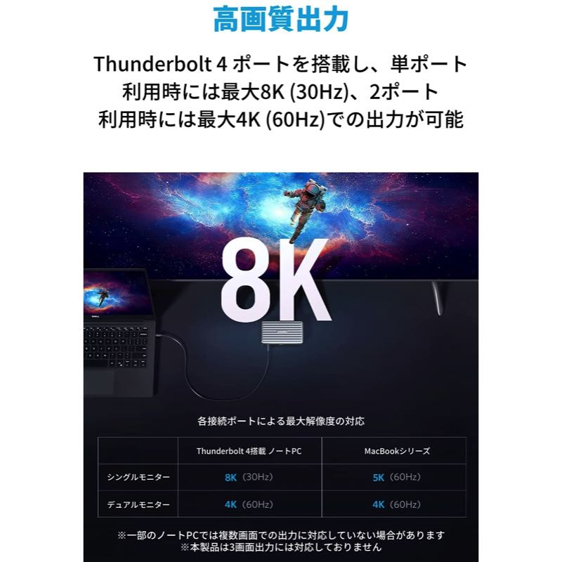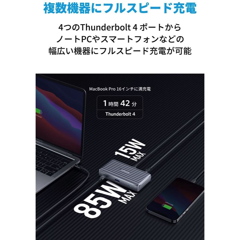 よくある質問Q1:この製品はすべてのノートPCに対応していますか?また使用中のノートPCと接続する方法を確かめることはできますか? この製品はThunderbolt 4 に対応したノートPCとThunderbolt 3 に対応したmacOS 11 (Big Sur) 以降のOS搭載のMacBook※でお使いいただけます。お使いのノートPCがThunderbolt 4 対応のものであるか、またはIntel EVOのロゴが貼られているかをお確かめください。またはお使いのノートPCの説明書をご確認いただくか、お使いのノートPCの製造元にお問い合わせください。 Q2:この製品はThunderbolt 3 に対応したWindows 10搭載のノートPCには対応していますか? Thunderbolt 3に対応したWindows 10搭載のノートPCでのご利用には、別売りのThunderbolt 3 対応ドッキングステーション (Anker PowerExpand Elite 13-in-1 Thunderbolt 3 Dock) の利用を推奨しています。 Q3:ノートPCとの接続にはどのケーブルを使用すればよいですか? 本製品利用時には同梱のThunderbolt 4 ケーブルをご使用ください。同梱のケーブルを紛失した場合も、別売りのAnker製Thunderbolt 4 ケーブルをご利用いただくことが可能です。 Q4:2つのThunderbolt 4 ポートを搭載した1つのノートPCからHDMIポート搭載の2つの外部ディスプレイに接続するためには、どうすればよいですか? USB-C & HDMIケーブル、またはUSB-C & HDMIアダプタをお使いください。 Q5:この製品はいくつの外部ディスプレイに接続可能ですか?また、複数画面出力時の最大解像度はどの程度ですか? この製品は単体で、2つの外部ディスプレイに同時接続が可能です。Thunderbolt 4 ダウンストリームポートから接続することができます。 複数の外部ディスプレイ接続時の最大解像度 ※85WのThunderbolt 3ポートはお使いのノートPCに接続している前提 1つの外部ディスプレイ: - Windows - 最大8K (7680 x 4320 px (30Hz) ) - macOS - 最大5K (5120 x 2880 px (60Hz) ) 2つの外部ディスプレイ: - 最大4K (3840 x 2160 px (60Hz) ) Q6:充電出力が85Wと表示されていて、MacBook Pro 16インチに付属の充電器以下の出力ですが、MacBook Pro 16インチを充電することは可能ですか? はい、本製品は背面のThunderbolt 4 アップストリームポート (ノートPCのアイコンで示されています) から最大85W出力が可能です。MacBook Pro 16インチに付属の充電器より充電スピードは低下しますが、MacBook Pro 16インチへの充電も可能です。 Q7:この製品でスマートフォンを高速充電することは可能ですか? 可能です。Thunderbolt 4 ダウンストリームポートから最大15Wでの出力が可能で、Pixel 5、Galaxy S21+等を含む幅広いスマートフォンにフルスピード充電が可能です。 |