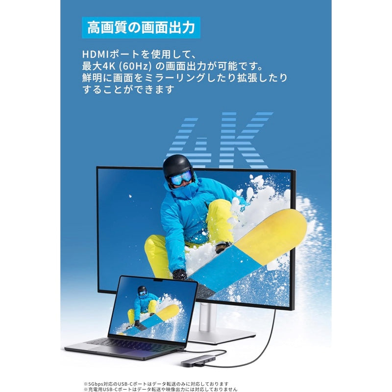 HDMIポートを使用して、最大4K (60Hz) の画面出力が可能です。鮮明に画面をミラーリングしたり拡張したりすることができます。