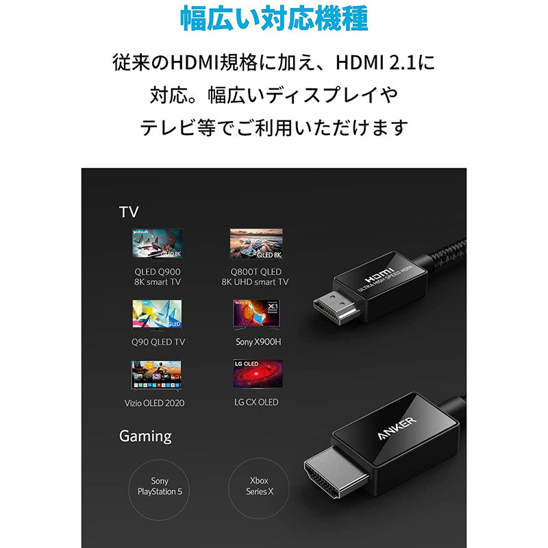 | パッケージ内容 | Anker Ultra High Speed HDMI ケーブル、18ヶ月保証 + 6ヶ月 (Ankerで会員登録後) 、カスタマーサポート |