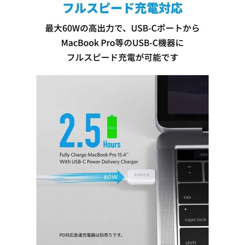 最大60Wの高出力で、USB-Cポートからスマートフォン、タブレット端末、ノートPC等のUSB-C機器にフルスピード充電が可能です。PD対応(18W)の充電器と共に使用することでSamsung Galaxy S10にわずか30分で50%まで充電することが可能です。(充電器は別売です)利便性とデザインの追求