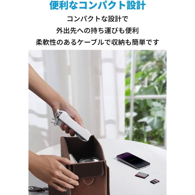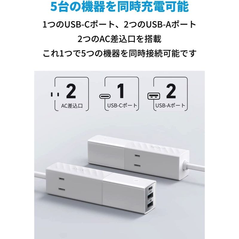 AC差込口 (x2) 、USB-Aポート (x2) 、USB-Cポート (x1) を搭載。これ1つで最大5台の機器に同時充電が可能です。持ち運びに便利なコンパクト設計