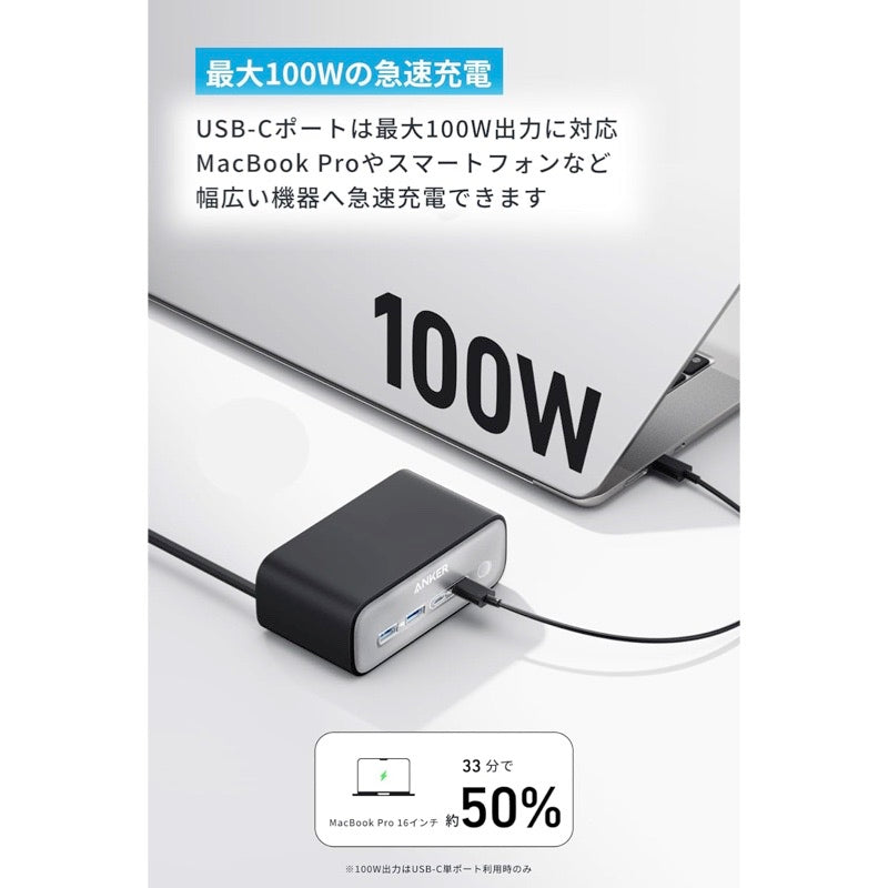 USB-Cポートは最大100W出力に対応し、MacBook ProなどのノートPCやスマートフォンなど幅広い機器へ急速充電できます (100W出力はUSB-C単ポート利用時のみ) 。これ1台でデスクがスッキリ