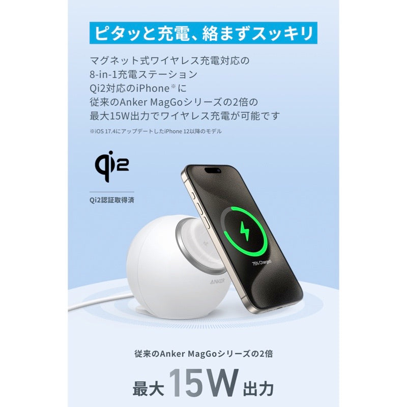 マグネット式ワイヤレス充電に対応の8-in-1充電ステーション。Qi2対応のiPhone (※) に、従来のAnker MagGoシリーズの2倍の最大15W出力でワイヤレス充電が可能です。特設LPはこちら