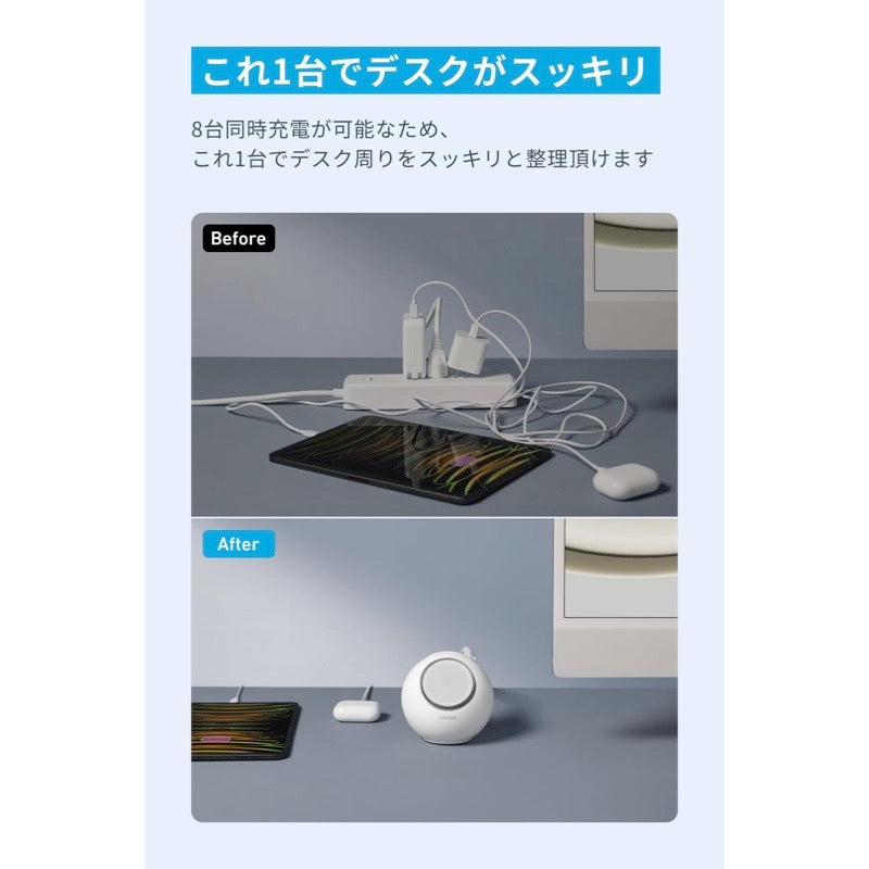 マグネット式ワイヤレス充電パッド (×1)、AC差込口 (×3)、USB-Cポート (×2)、USB-Aポート (×2) からの充電がこれ1台にまとまり、8台同時に充電可能です。