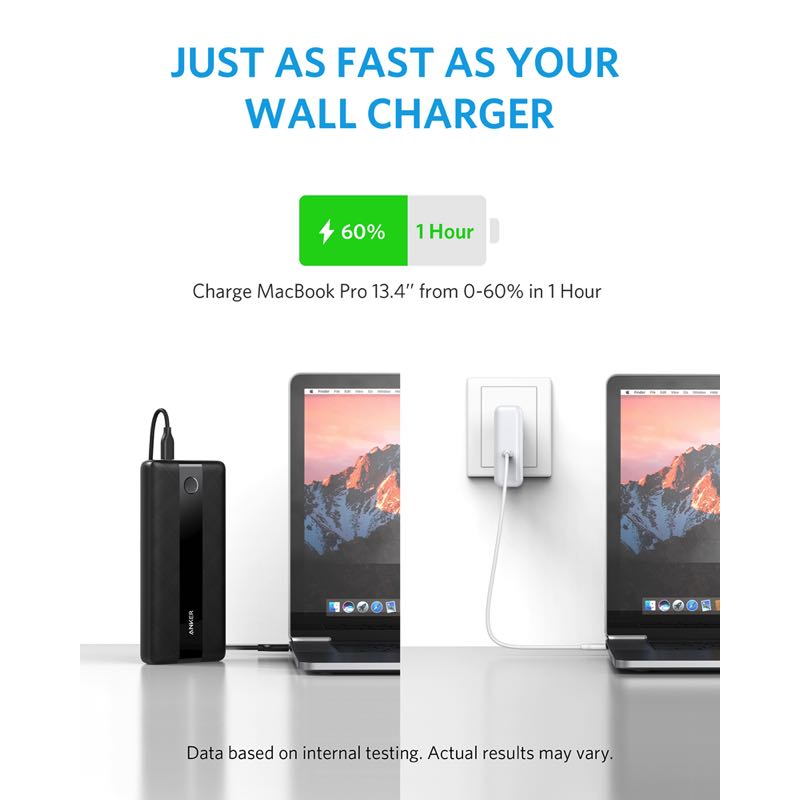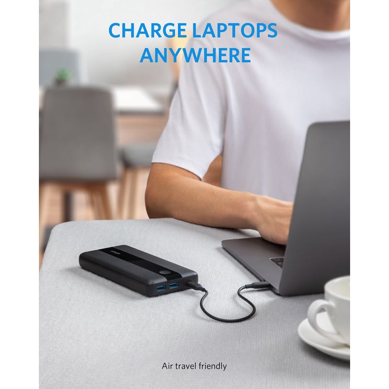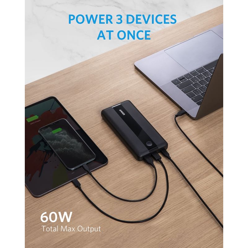 USB-Cポートは最大60Wの高出力に対応し、お使いのUSB-C対応のノートPCにフルスピード充電が可能。また、USB-Cポートと2つのUSB-Aポートから最大3つの機器へ同時に充電できます。ノートPC 約1回分充電可能