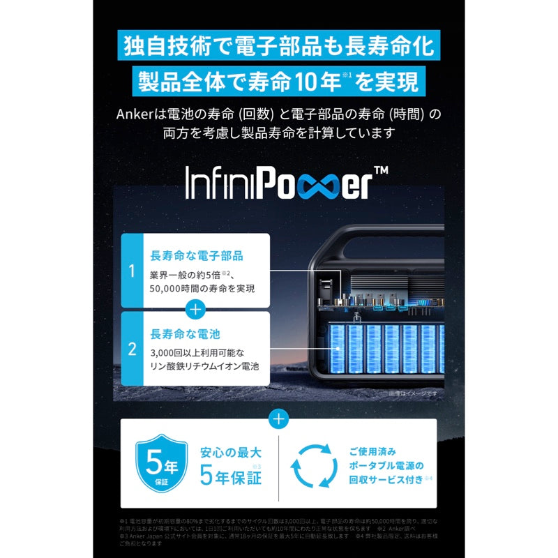 ※Anker Japan 公式オンラインストア会員を対象に、通常18ヶ月の製品保証を5年へ自動延長致します。ポータブル電源とソーラーパネルのセットモデル