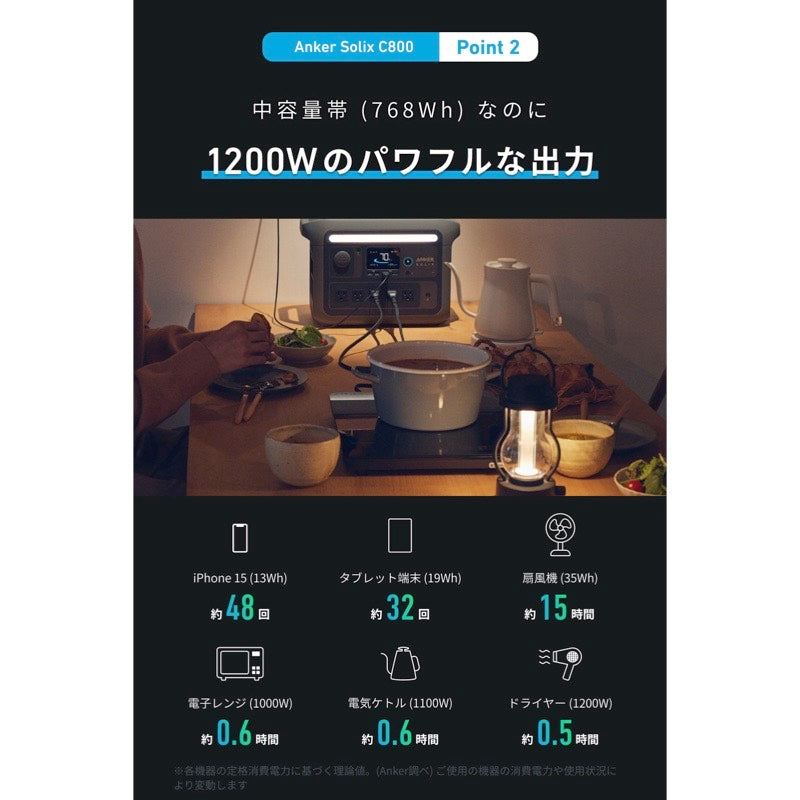 768Whの中容量帯ながら、1200Wを安定して出力できるパワフルな一台です。 電気ケトルやドライヤーなど消費電力の高い電化製品もご利用いただけます。※2023年9月時点 700Wh帯において、Anker調べ。