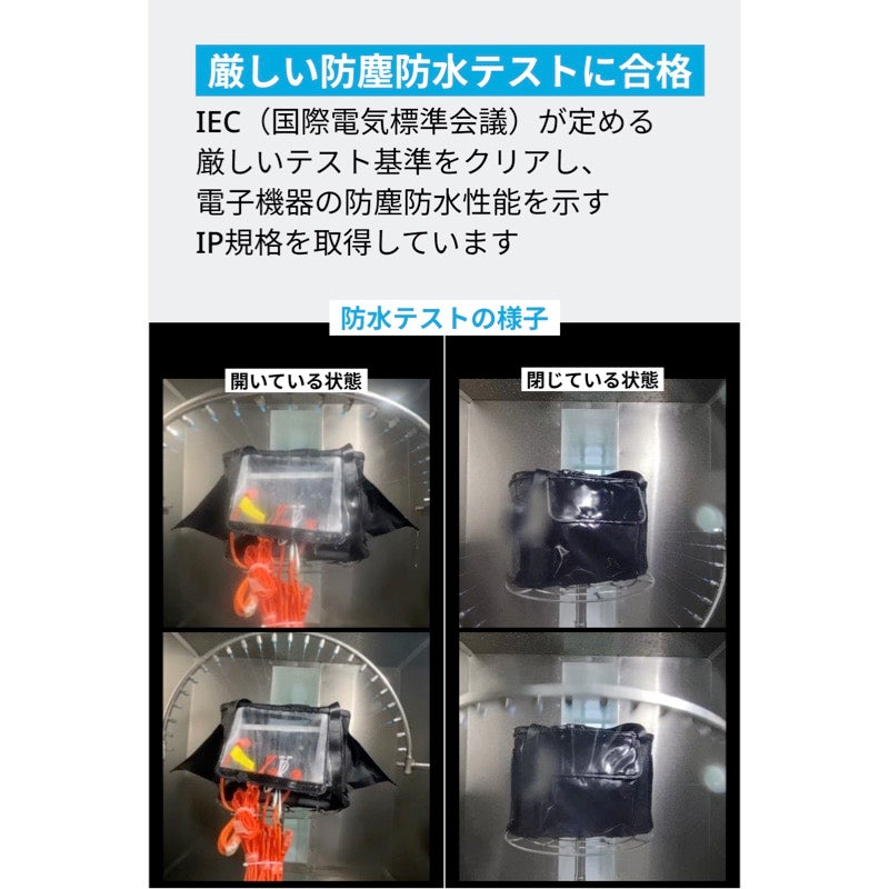 Anker SolixシリーズのC1000 / C800 / C800 Plus専用の防塵 / 防水バッグです。Ankerの防塵防水バッグは、雨や粉塵から本体を保護しながら、バッグに入れたままポータブル電源を使用することができます。付属バッグの特徴①厳しい防塵防水テストに合格:IP54を取得