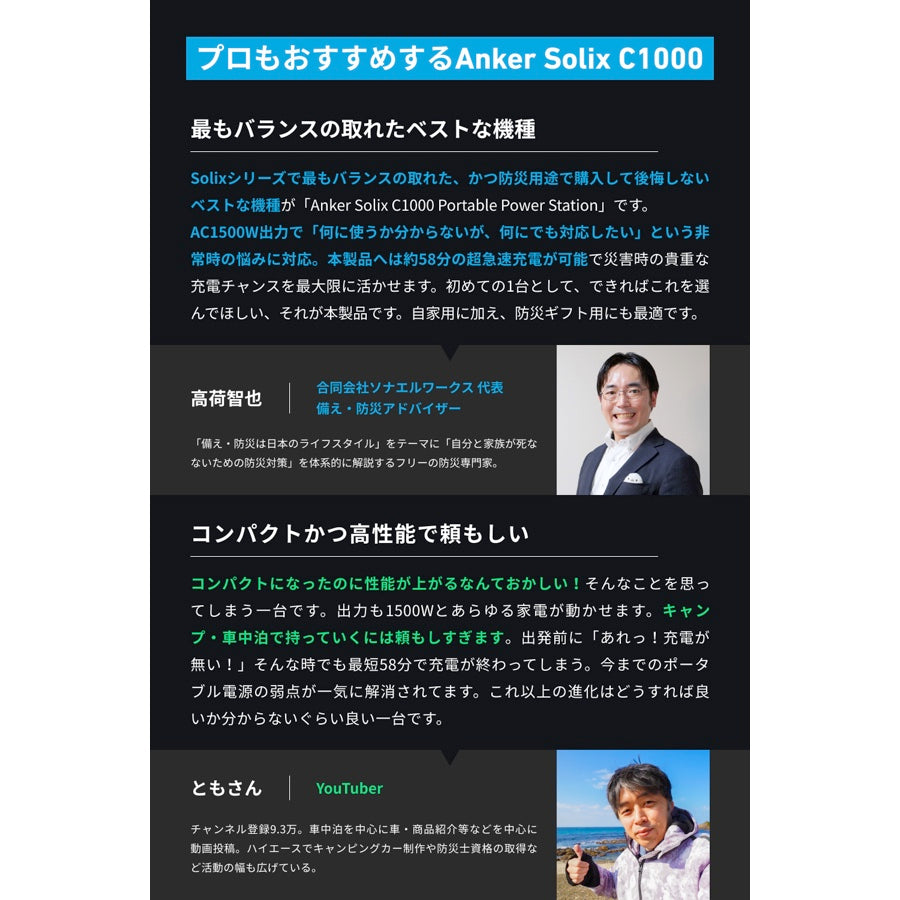 | 補足説明 | Anker Solix C1000 Portable Power Station 製品の仕様・注意点はこちら Anker Solix PS200 Portable Solar Panel 製品の仕様・注意点はこちら |