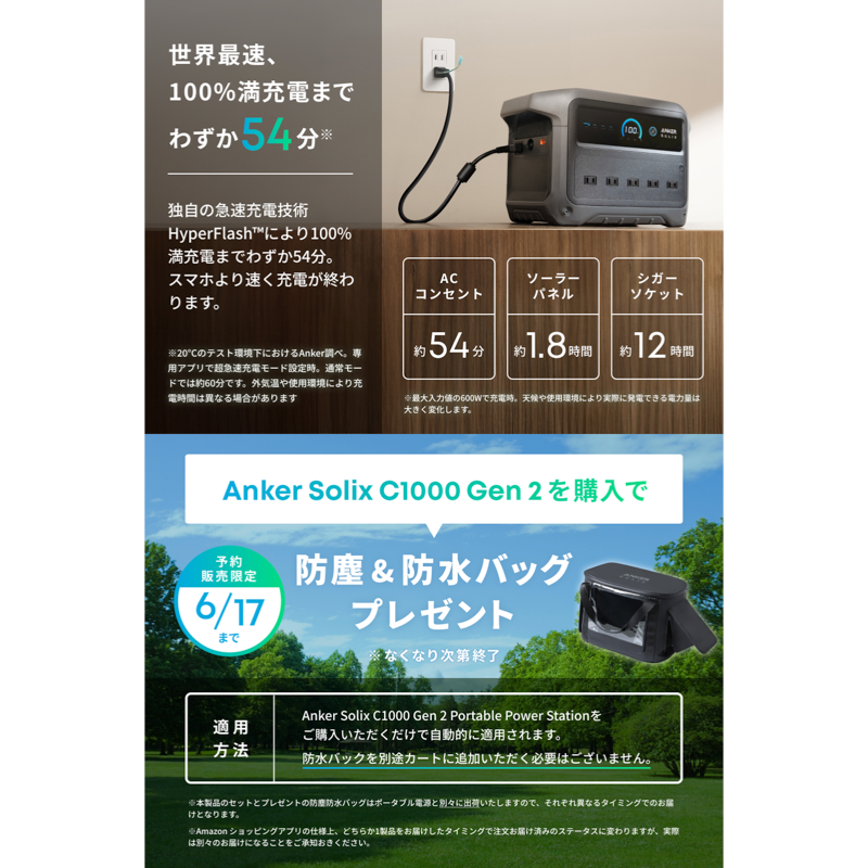 | パッケージ内容 | Anker Solix C1000 Gen 2 Portable Power Station、シガーソケット充電ケーブル、AC充電ケーブル、Anker Solix PS100 Compact Portable Solar Panel、MC4 & XT-60ケーブル (0.5m) 、MC4 & MC4延長ケーブル (3m) x2クイックスタートガイド、安全マニュアル |