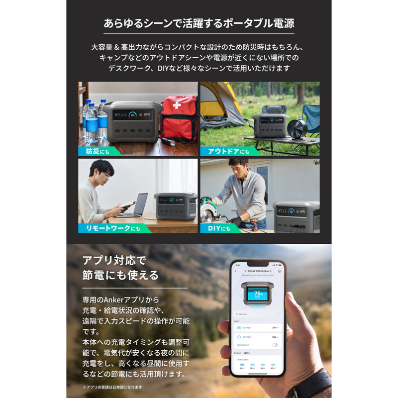 大容量 & 高出力ながらコンパクトな設計のため、防災時はもちろん、キャンプなどのアウトドアシーンや電源が近くにない場所でのデスクワーク、DIYなど様々なシーンで活用いただけます