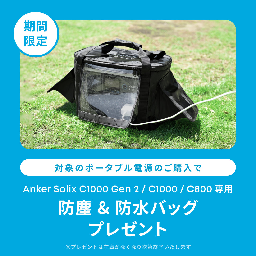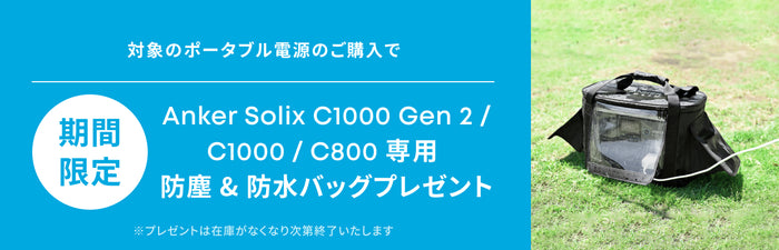 | パッケージ内容 | Anker Solix C1000 Gen 2 Portable Power Station、シガーソケット充電ケーブル、AC充電ケーブル、Anker Solix PS200 Portable Solar Panel、MC4 & XT-60ケーブル (0.5m) 、MC4 & MC4延長ケーブル (3m) x2クイックスタートガイド、安全マニュアル |