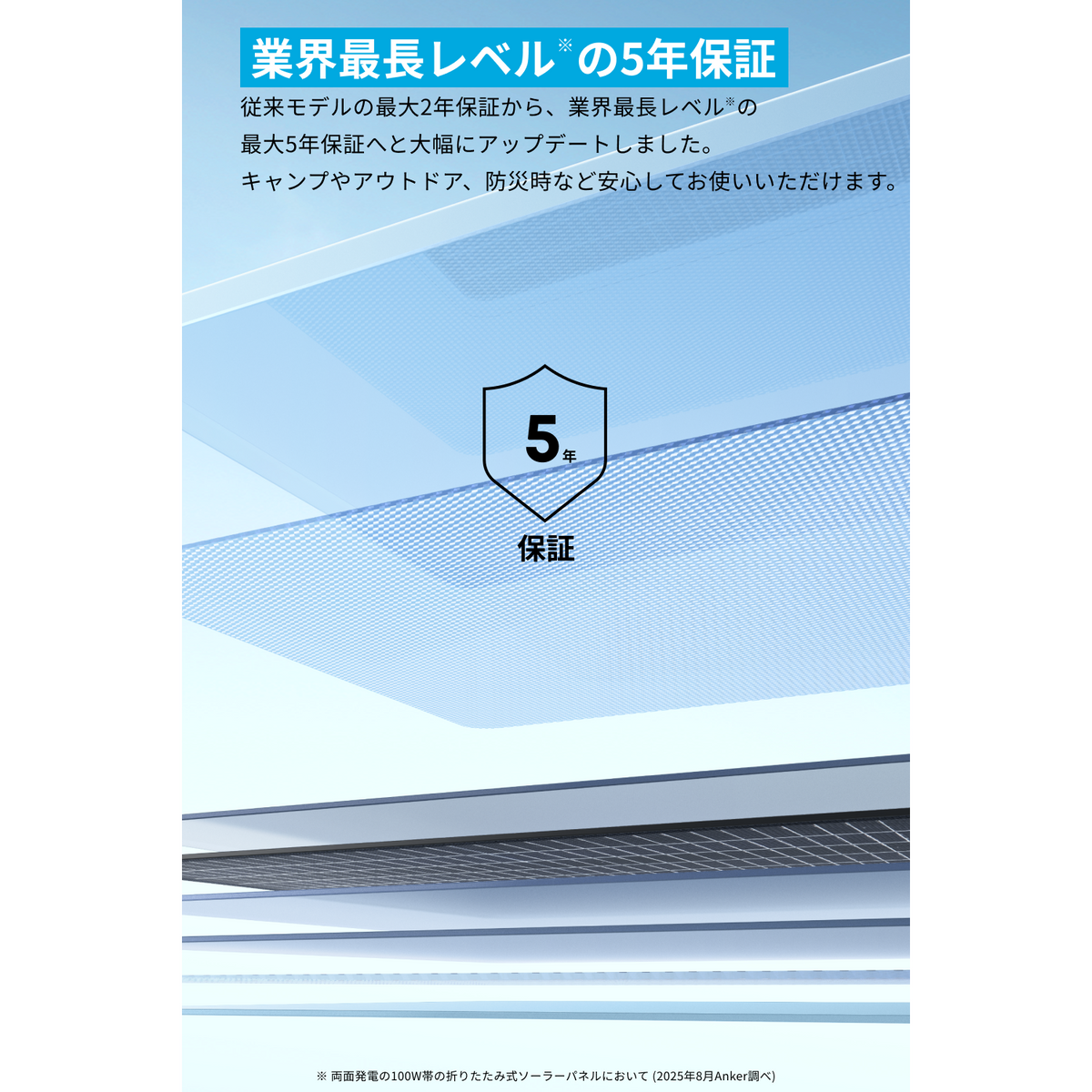※両面発電の100W帯の折りたたみ式ソーラーパネルにおいて (2025年8月Anker調べ)
