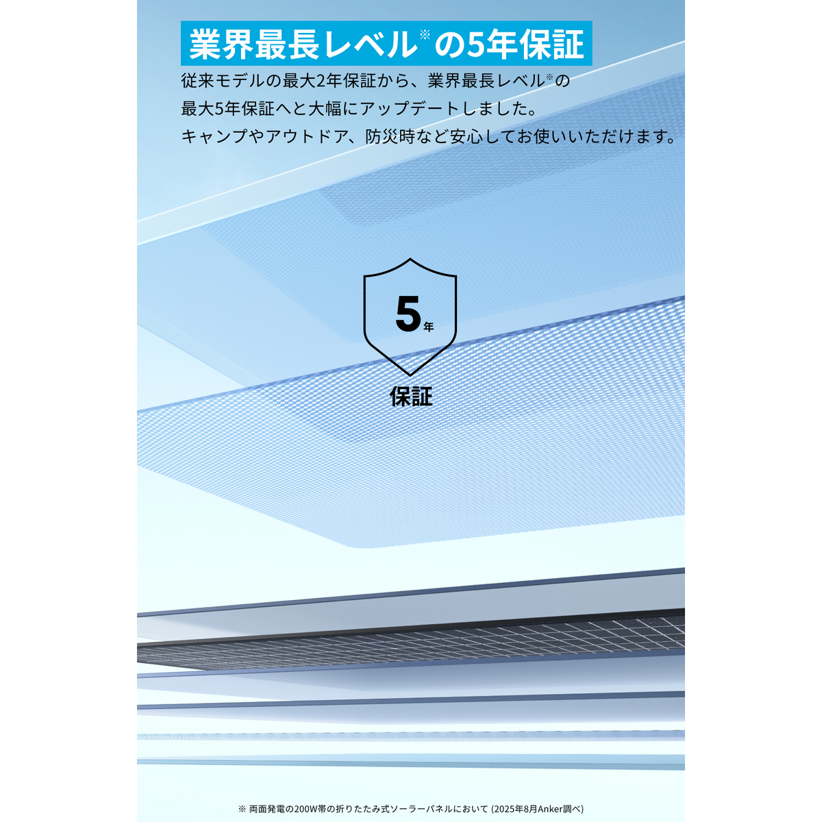※両面発電の200W帯の折りたたみ式ソーラーパネルにおいて (2025年8月Anker調べ)