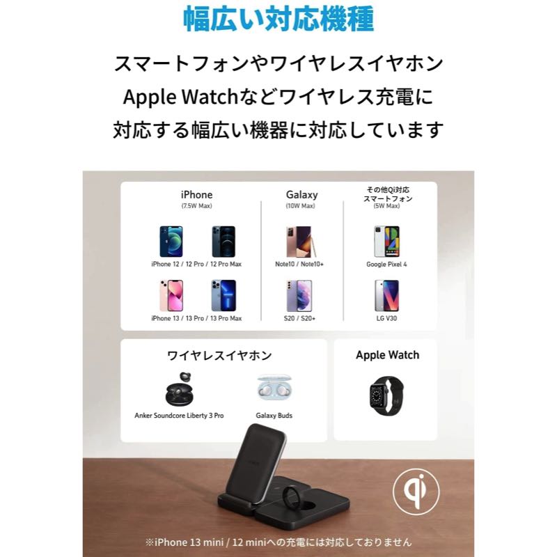 組み立てることで、お使いのスマートフォンやワイヤレス充電対応のイヤホン、Apple Watchを3台同時に充電することが可能です。また、折りたたむことで、外出先に持ち運ぶこともできます。 (※本製品はMagSafe充電には対応しておりません。)