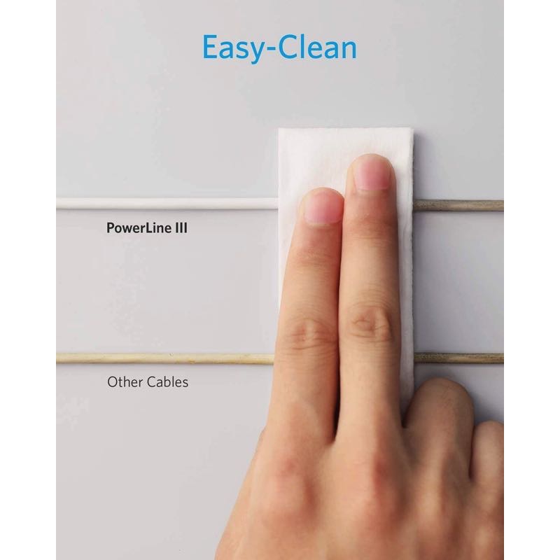 Anker PowerLine III ライトニングUSBケーブルが汚れたり、黄ばんだりしても心配ありません。表面には防塵加工が施されているため、汚れがついても濡れた布で拭くだけで新品同様の見た目に戻ります。