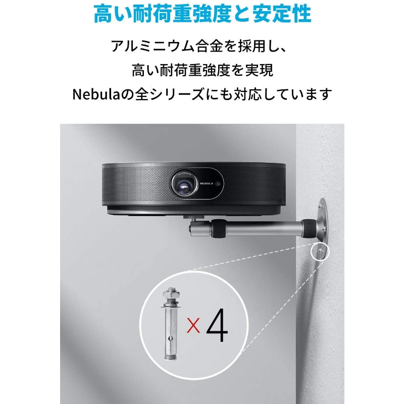 | パッケージ内容 | Anker Nebulaプロジェクターマウント、1/4インチサイズのネジ×4、取扱説明書、 18ヶ月保証 + 6ヵ月 (Ankerで会員登録後)、カスタマーサポート |