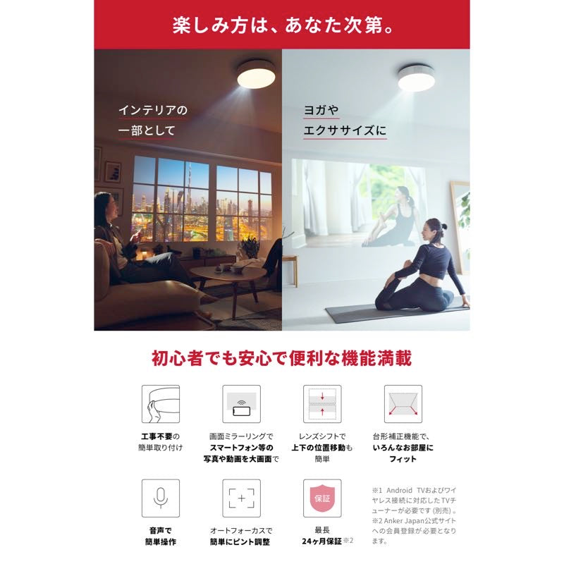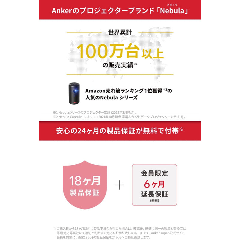 - Nebula Nova、ランプシェード、引掛シーリング用専用アダプタ、リモコン (単4形電池×2付属) 、取扱説明書、18ヶ月保証 + 6ヶ月 (Ankerで会員登録後) 、カスタマーサポート
