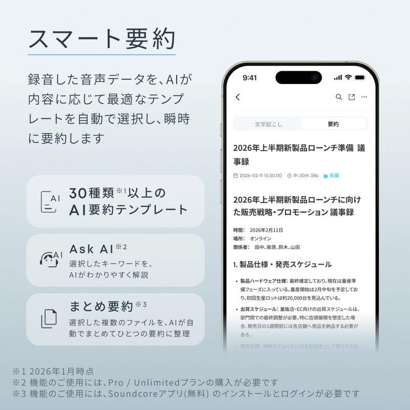 Soundcore Workをご購入いただくと、Starterプラン(300分/月までのAI文字起こし・自動要約)を無料特典としてご利用いただけます。※Soundcoreアプリ連携後、プランをご購入いただけます。Pro / Unlimited プランならより便利なAI機能を利用できます