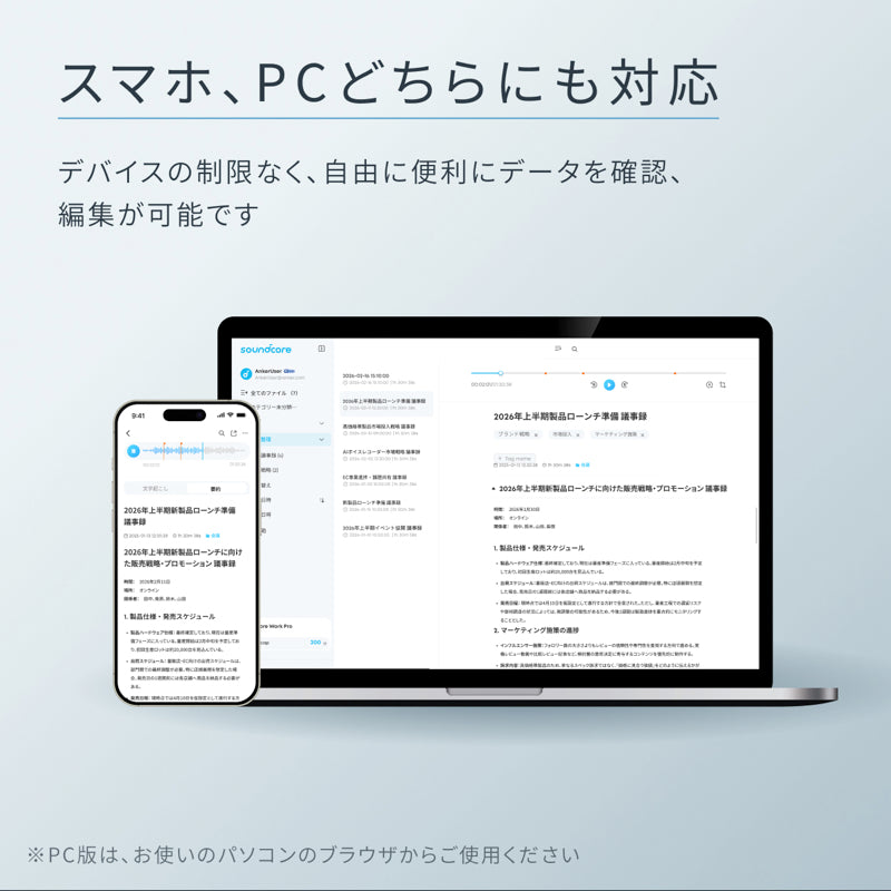 世界最小・最軽量※のウェアラブルAIボイスレコーダーで、商談メモ、会議の議事録などにかかる時間を節約できます。※マイク本体のみを指す。2026年1月時点、自社調べ