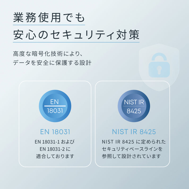 高度な暗号化技術により、データを安全に保護する設計。EN 18031-1 および EN 18031-2 に適合し、NIST IR 8425 に定められたセキュリティベースラインを参照して設計されています。