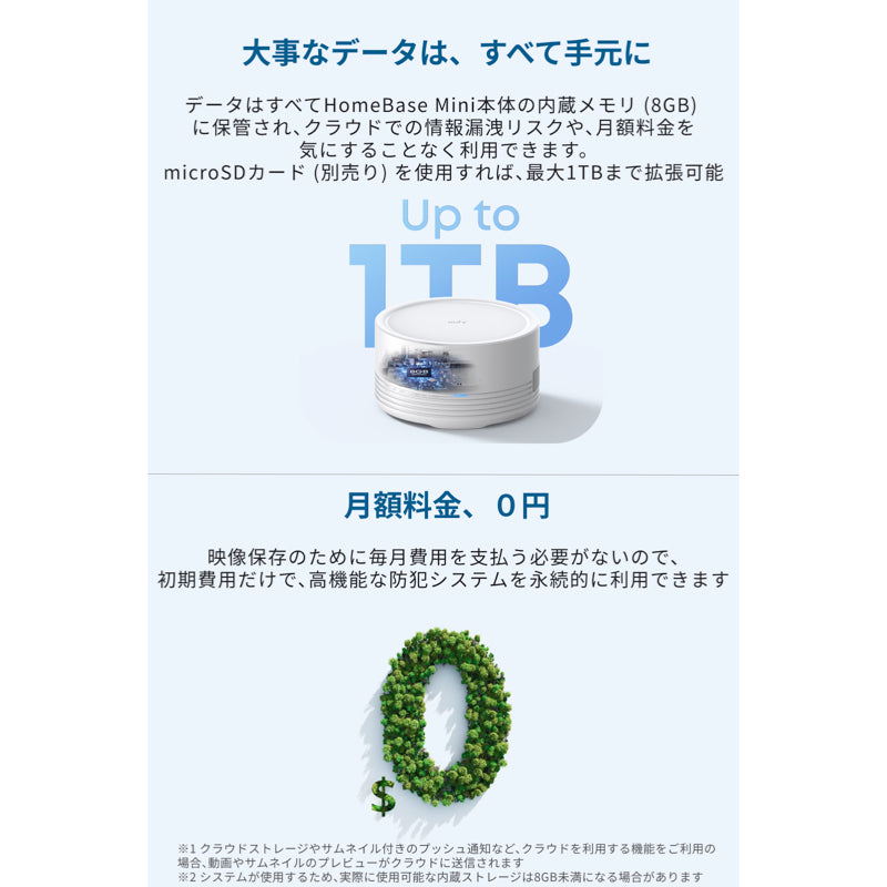 データはすべてHomeBase Mini本体の内蔵メモリ (8GB) に保管され、クラウドでの情報漏洩リスクや、月額料金を気にすることなく利用できます。microSDカード (別売り) を使用すれば、最大1TBまで拡張可能。