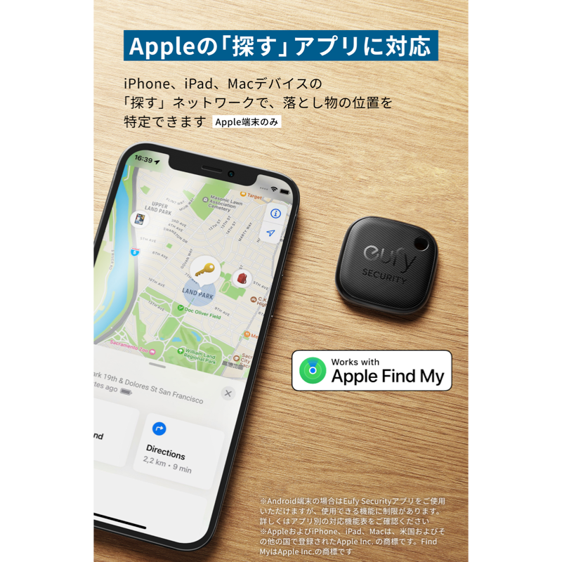 ※iOSの「探す」アプリ、Android OSの「Eufy Security」アプリに対応。Bluetooth接続範囲を離れて約3分後に通知が届きます。位置情報の利用許可を「常に」設定する必要があります