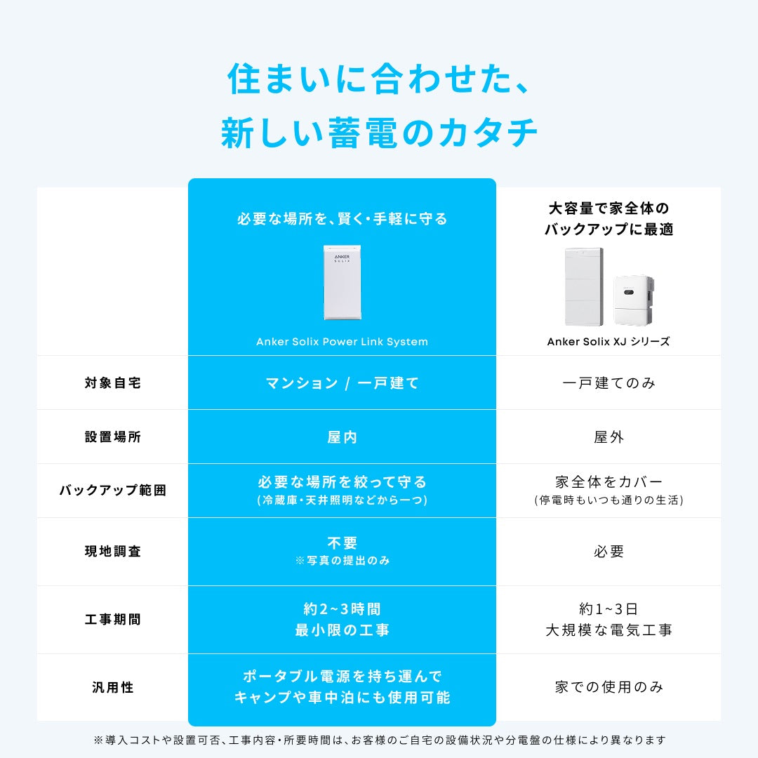 | ご注意 | ・本製品(切替分電盤)の設置にあたり、メイン分電盤(ブレーカー)の左右または上下に横幅21cm程度、高さ40cm程度のスペースを確保いただく必要がございます。 ・ポータブル電源を設置する場所はメイン分電盤(ブレーカー)から5m以下である必要がございます。※室内設置のみ対応 ・お客様のご自宅の構造などにより、ポータブル電源をご希望箇所に設置できない場合がございます。その場合は現地にてご相談の上、設置可能な場所へ設置位置を変更させていただく場合がございます。 ・作業時は回路確認の為にブレーカを落とす停電確認作業がございます。 ・Anker Solix Power Link Systemは容量1000Wh以上かつAC定格出力が1500W以上のポータブル電源に対応していますが、Anker製以外のポータブル電源は保証の対象外になります。 下記のAnker製ポータブル電源のご利用を推奨いたします。下記以外のポータブル電源のご利用を検討されている方は、Anker Solix Power Link Systemのご購入前にAnker Solix専用窓口までご連絡ください。 Anker Solix C1000 Gen 2 Portable Power Station Anker Solix C1000 Portable Power Station Anker Solix C2000 Gen 2 Portable Power Station Anker Solix F3000 Portable Power Station Anker 767 Portable Power Station ・沖縄の一部や離島・北海道札幌市から150kmを超える遠方地域は施工を承れません。 ・賃貸マンションまたはアパートの場合、退去時の原状回復費用はお客様ご負担になります。 |