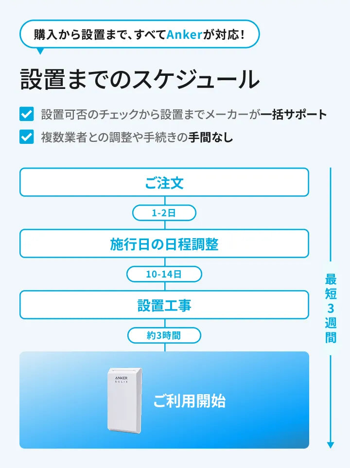 | ご注意 | ・本製品(切替分電盤)の設置にあたり、メイン分電盤(ブレーカー)の左右または上下に横幅21cm程度、高さ40cm程度のスペースを確保いただく必要がございます。 ・ポータブル電源を設置する場所はメイン分電盤(ブレーカー)から5m以下である必要がございます。※室内設置のみ対応 ・お客様のご自宅の構造などにより、ポータブル電源をご希望箇所に設置できない場合がございます。その場合は現地にてご相談の上、設置可能な場所へ設置位置を変更させていただく場合がございます。 ・作業時は回路確認の為にブレーカを落とす停電確認作業がございます。 ・Anker Solix Power Link Systemは容量1000Wh以上かつAC定格出力が1500W以上のポータブル電源に対応していますが、Anker製以外のポータブル電源は保証の対象外になります。 下記のAnker製ポータブル電源のご利用を推奨いたします。下記以外のポータブル電源のご利用を検討されている方は、Anker Solix Power Link Systemのご購入前にAnker Solix専用窓口までご連絡ください。 Anker Solix C1000 Gen 2 Portable Power Station Anker Solix C1000 Portable Power Station Anker Solix C2000 Gen 2 Portable Power Station Anker Solix F3000 Portable Power Station Anker 767 Portable Power Station ・沖縄の一部や離島・北海道札幌市から150kmを超える遠方地域は施工を承れません。 ・賃貸マンションまたはアパートの場合、退去時の原状回復費用はお客様ご負担になります。 |