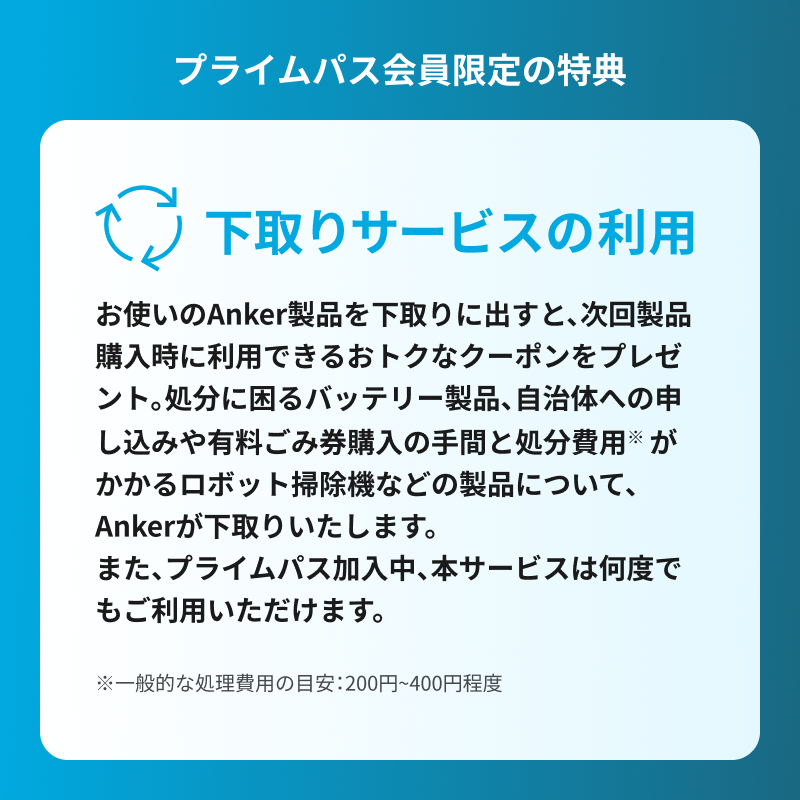年会費 (年間 税込1,980円) をご登録カードより自動引き落とし致します。詳細については、Anker マイレージプログラム プライムパス利用規約も併せてご覧ください。